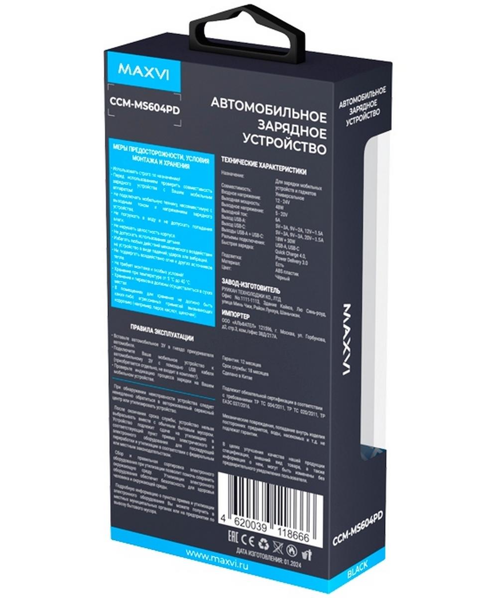 АЗУ Maxvi CCM-MS604PD — это компактное и универсальное автомобильное зарядное устройство, предназначенное для работы от бортовой сети с напряжением 12 В или 24 В, что позволяет использовать его как в легковых автомобилях, так и в коммерческом транспорте.