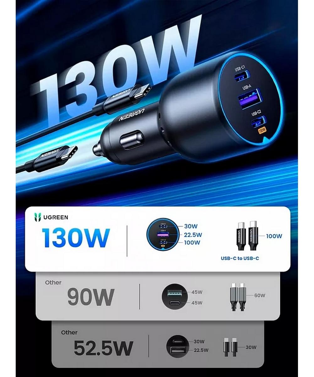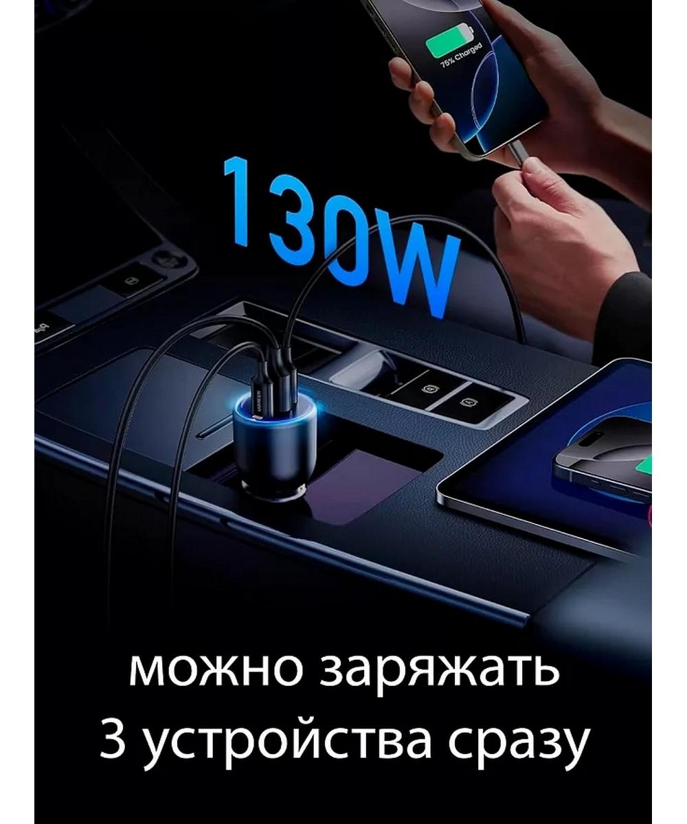 Это автомобильное зарядное устройство мощностью 130 Вт обеспечивает быструю и стабильную зарядку для целого ряда устройств — от смартфонов и планшетов до ноутбуков, автомобильных пылесосов и видеорегистраторов. Оно подключается через USB Type-C или USB Type-A, имеет три порта и поддерживает передовые технологии быстрой зарядки, включая PD 100W, PPS 45W и другие стандарты.