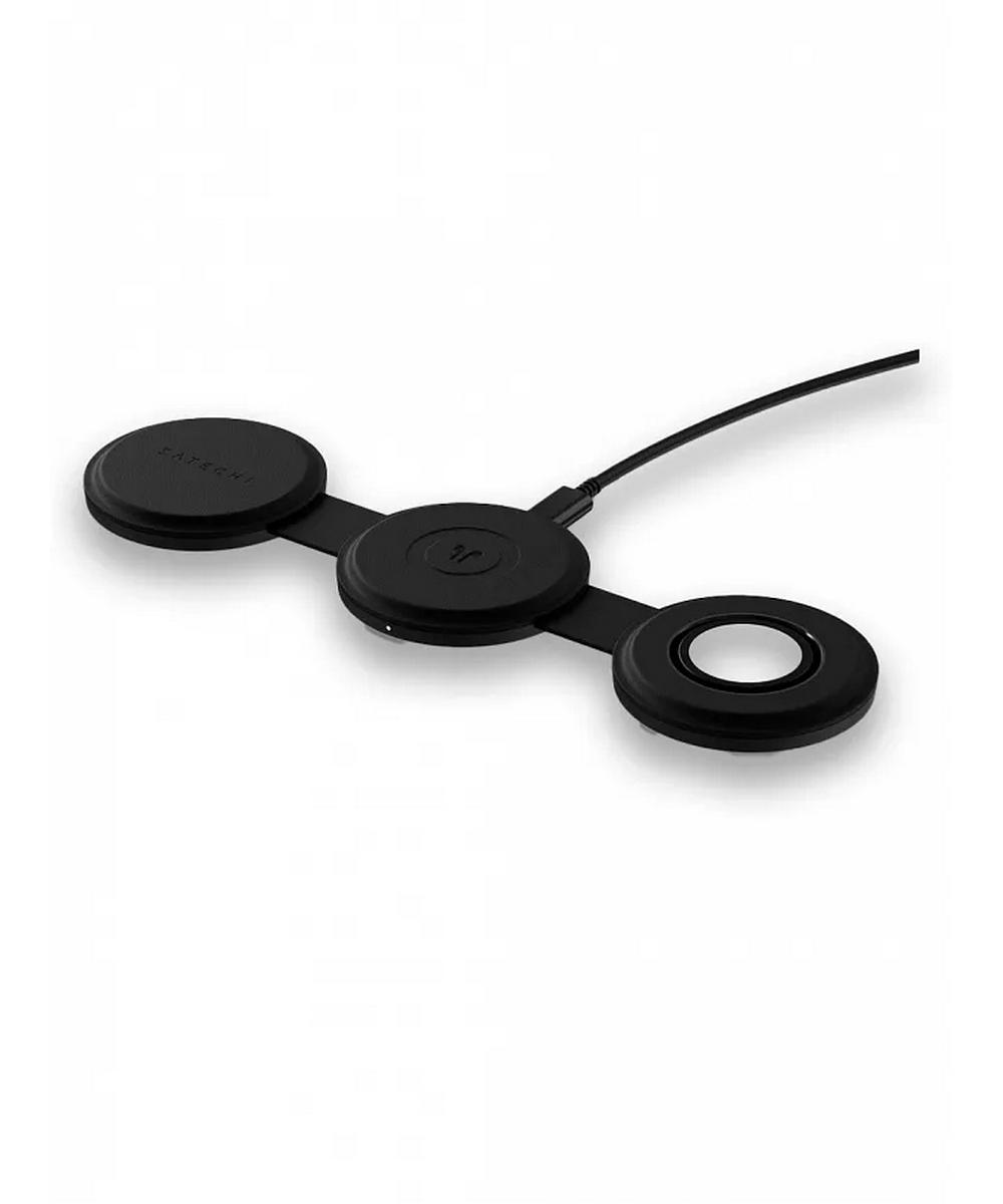 Встроенные магниты гарантируют точное выравнивание катушек, что повышает эффективность зарядки. Конструкция складывается и имеет компактную круглую форму, поэтому устройство удобно брать с собой в дорогу — оно легко помещается в карман или дорожную сумку. Корпус выполнен из качественных и более экологичных материалов, что делает аксессуар долговечным и безопасным для окружающей среды. Для подключения используется порт USB-C, в комплект входит кабель длиной 1 метр, чехол для переноски и руководство пользователя. Зарядное устройство совместимо с широким спектром техники, включая модели iPhone 12–16, Apple Watch серий 1–10 и Ultra, AirPods с MagSafe-чехлом, а также некоторые устройства Samsung, Google, OnePlus и Sony. Чтобы магнитное крепление работало корректно, чехол устройства не должен превышать 3 мм толщины и не содержать