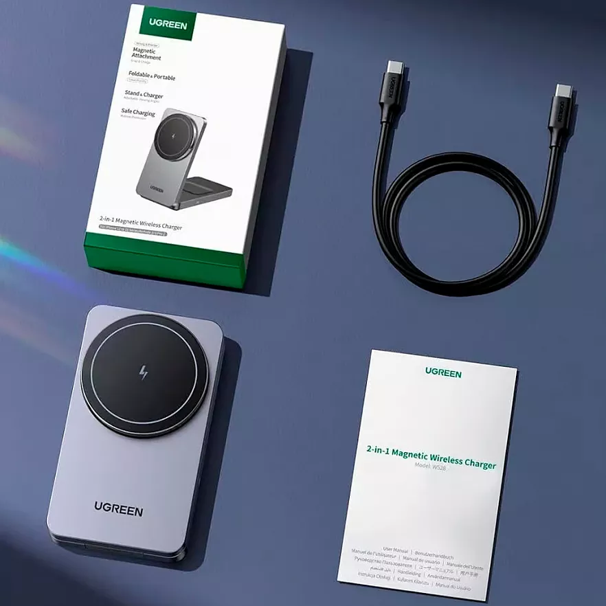 Магнитная зарядная станция позволяет одновременно заряжать iPhone и AirPods, избавляя от лишних проводов и обеспечивая порядок на рабочем месте. Компактный и складной дизайн делает устройство удобным для путешествий: оно занимает на 40% меньше места, чем аналоги, и легко помещается в сумку. Встроенное магнитное кольцо обеспечивает надежное крепление и позволяет устанавливать устройство в вертикальном или горизонтальном положении для комфортного использования.