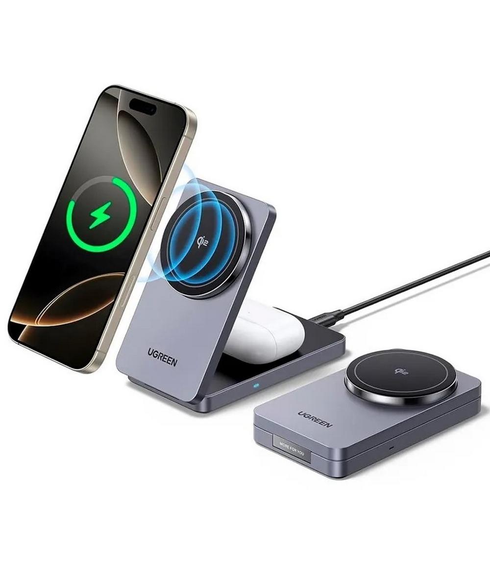Особенности: Компактный складной дизайн, регулируемый угол наклона (до 70°), возможность одновременной зарядки двух устройств;