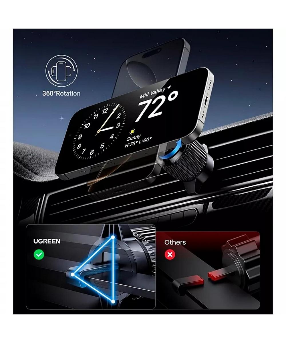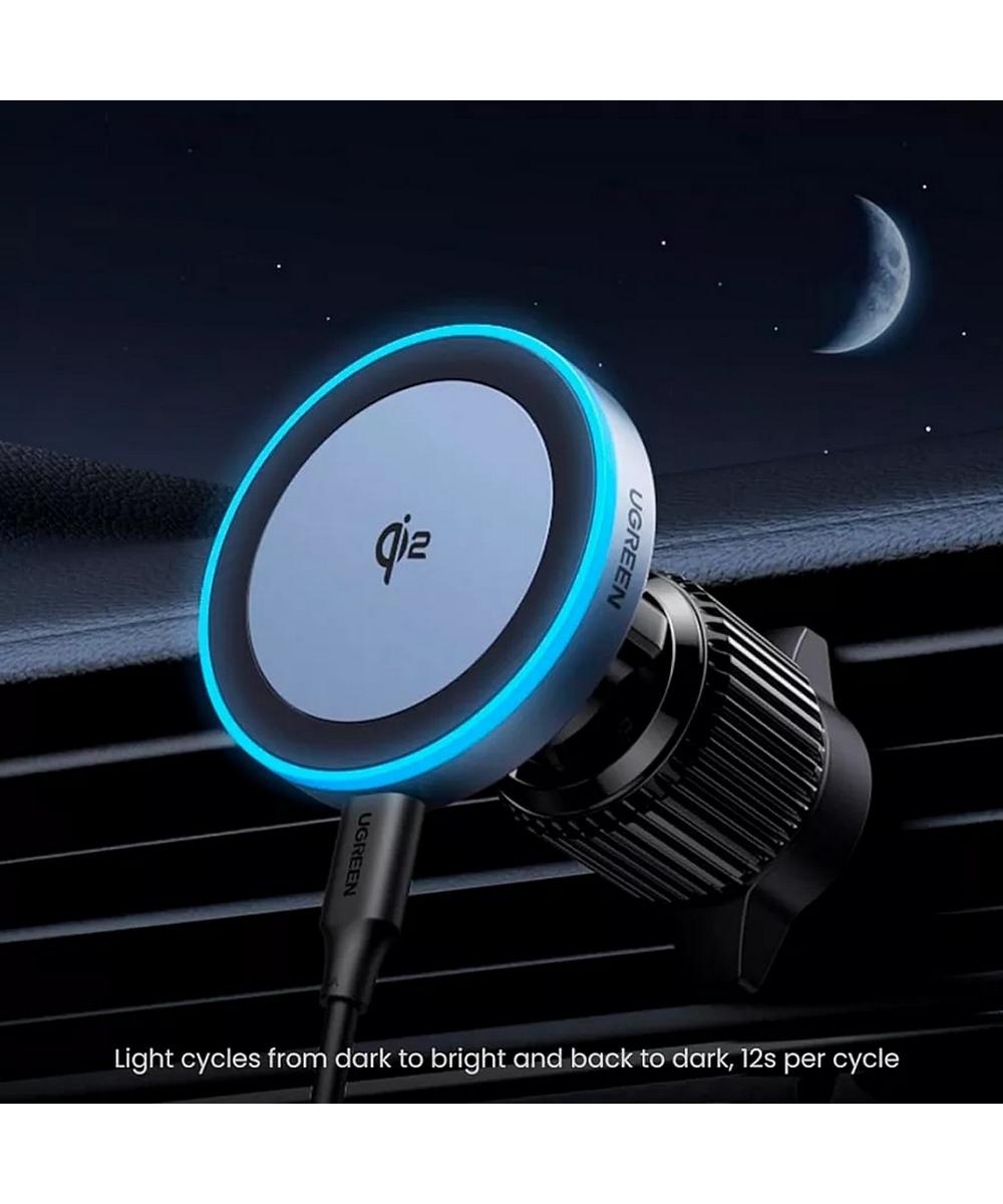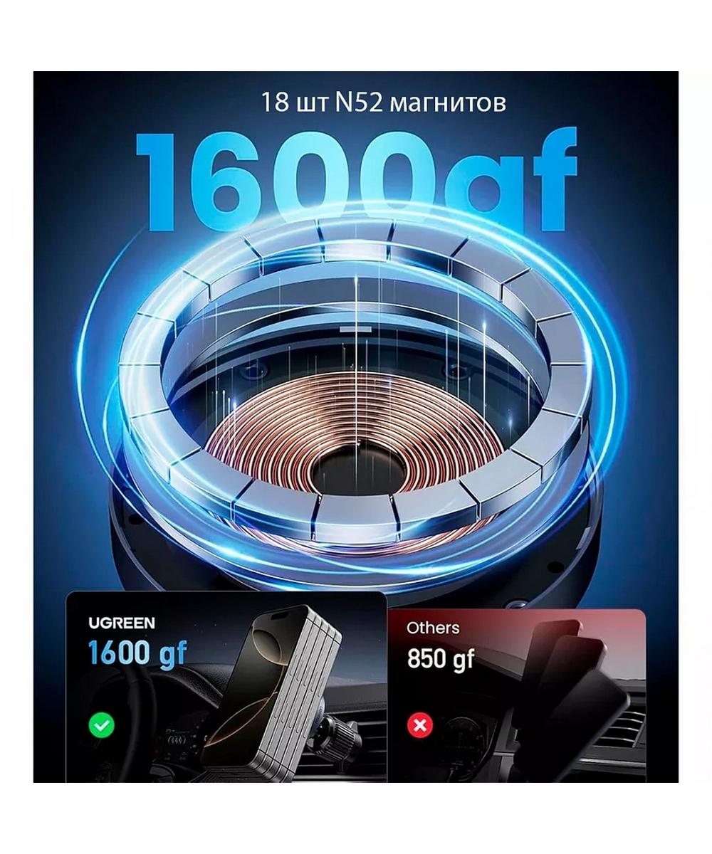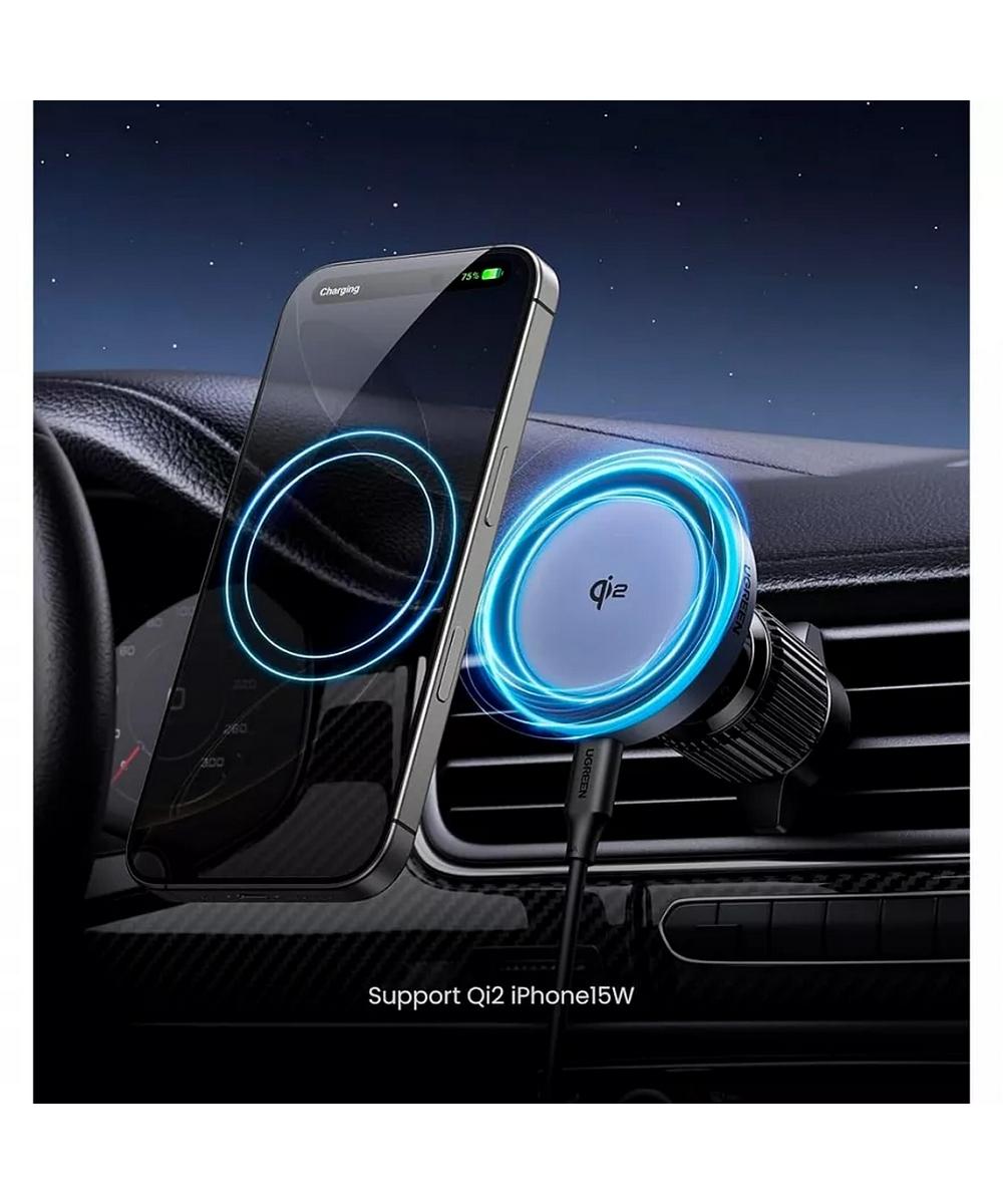 Этот беспроводной автомобильный держатель-зарядка предназначен для iPhone серий 12–16. Он поддерживает быструю зарядку 15 Вт с технологией Qi2 и мощной магнитной системой, обеспечивая стабильное крепление даже на неровной дороге.