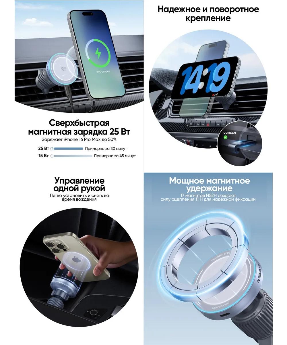 Беспроводное магнитное зарядное устройство UGREEN W758 (55967) «MagFlow» мощностью 25 Вт выполнено в стильном серебристо‑голубом цветовом исполнении это современное решение для быстрой и удобной зарядки мобильных гаджетов
