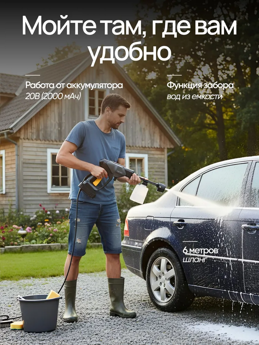 Аккумуляторная мойка высокого давления HOTO 20V Cordless High Pressure Washerи идеально подходит для мытья ступенек, зоны около бассейна, окон, машины, полива растений и деревьев.