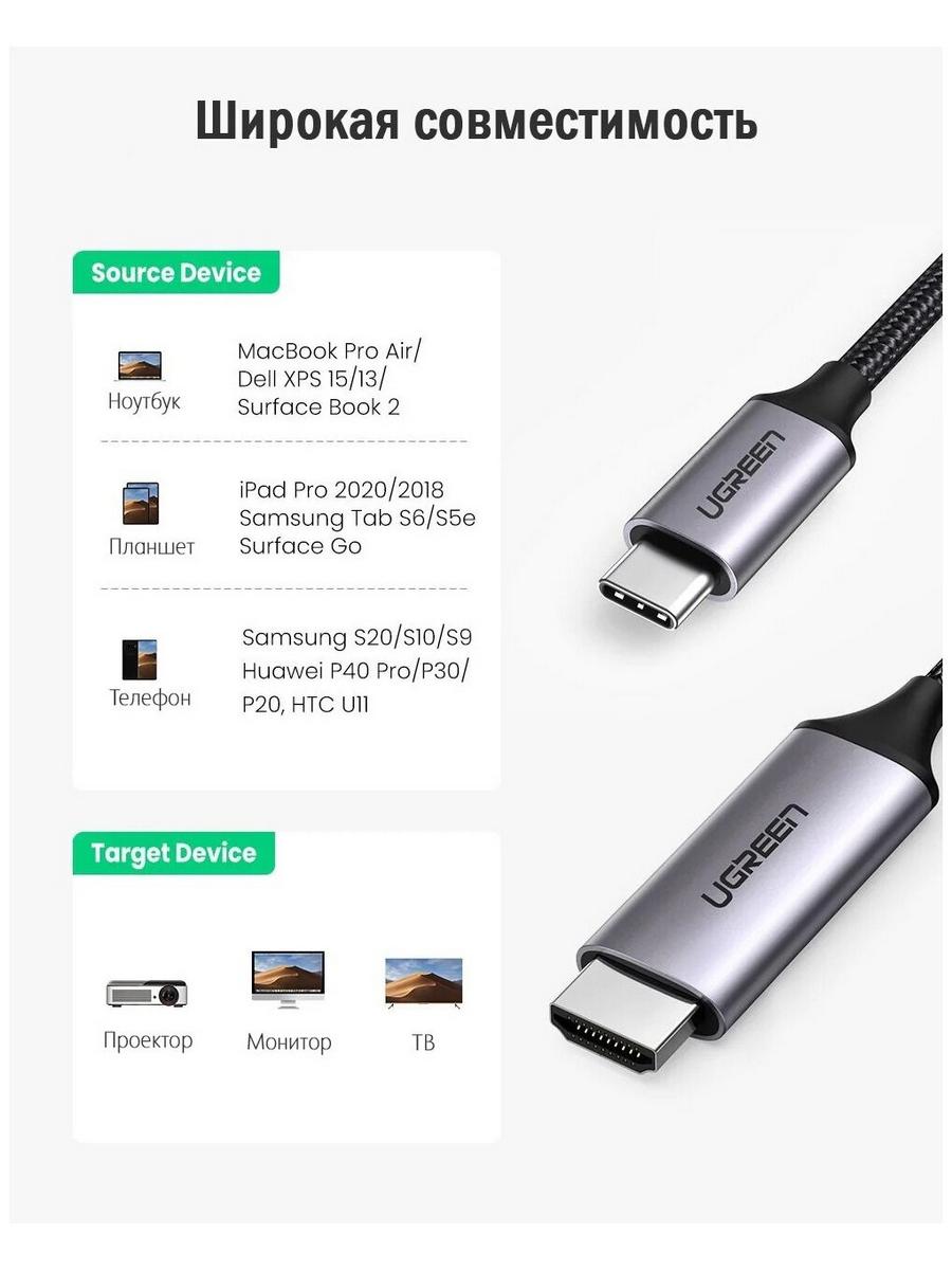 Высококачественный кабель, который позволяет подключать устройства с портом USB-C к устройствам с портом HDMI. Он поддерживает разрешение 4K Ultra HD (3840x2160) при 60 Гц, а также HDR10 и Dolby Vision, обеспечивая высокое качество изображения.