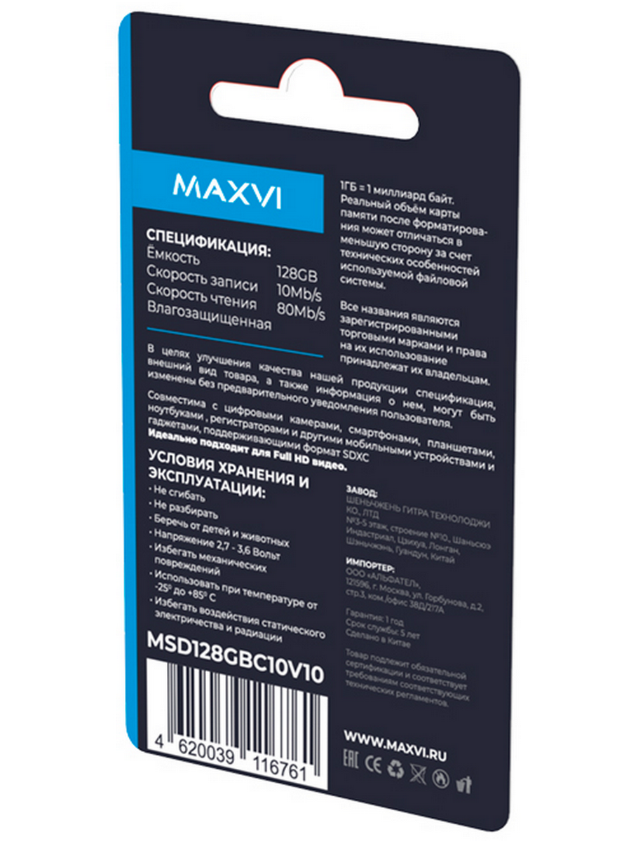 Карта памяти Maxvi microSDXC объёмом 128 ГБ предназначена для надёжного хранения и быстрого переноса данных на смартфонах, планшетах, видеорегистраторах, экшн-камерах и других совместимых устройствах. Поддержка стандарта Class 10 и интерфейса UHS-I обеспечивает высокую скорость чтения и записи, что позволяет комфортно работать с фото высокого разрешения, Full HD и 4K-видео без задержек и потери качества. Класс видеозаписи V10 гарантирует стабильную минимальную скорость записи, необходимую для непрерывной видеосъёмки.