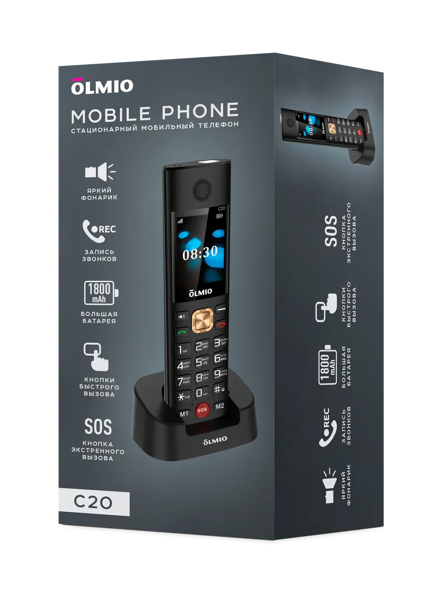 Olmio C20 — это удобный стационарный GSM-телефон для дома, дачи или офиса. Он совмещает простоту классического стационарного аппарата и свободу мобильной связи, работая от SIM-карты без привязки к городской телефонной линии. Идеальный выбор для пожилых людей, организаций и пользователей, привыкших к классическим проводным телефонам.
