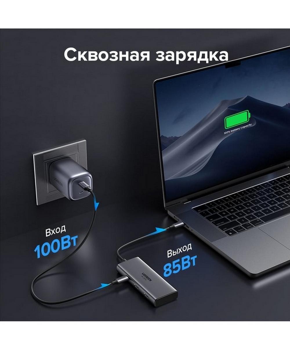 Также адаптер оснащен портом питания USB-C, который поддерживает зарядку PD мощностью до 100 Вт. Это позволяет заряжать устройства, подключенные к адаптеру, без необходимости использования дополнительных зарядных устройств.