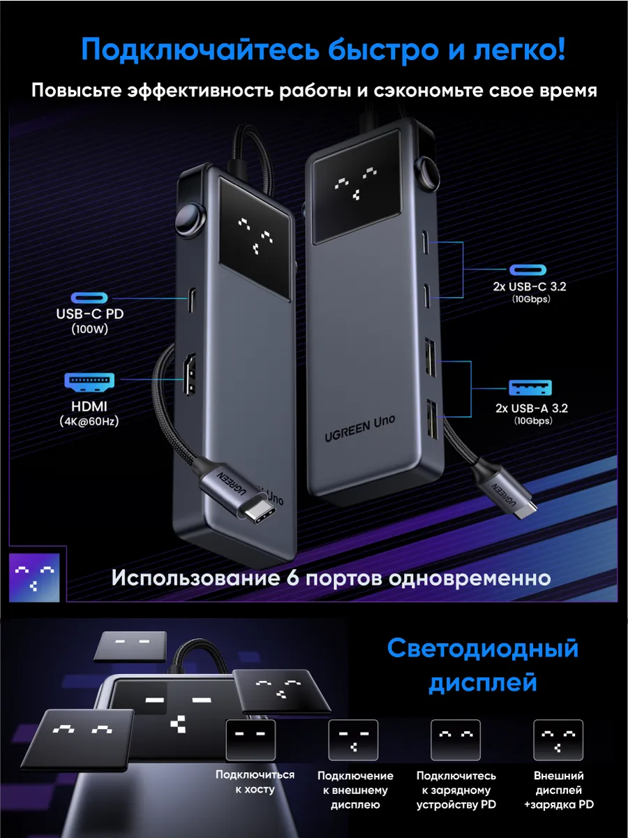 Конвертер UGREEN CM888 (35998) UNO 6-in-1 4K@60Hz USB-C To HDMI+2*USB 3.2 A+2*USB 3.2 C+PD Power Converter - это многофункциональное устройство, которое объединяет в себе множество полезных функций.
