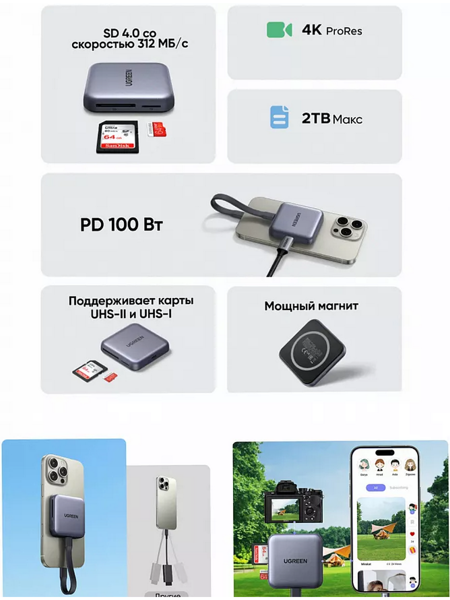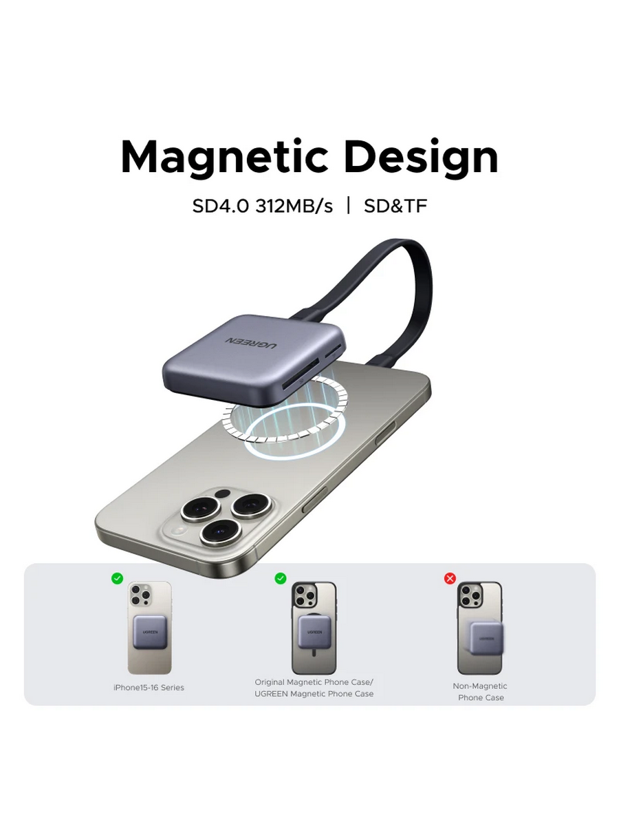 Кардридер магнитный 3-в-1 UGREEN CM898 (65095) USB-C & SD & TF - это устройство для чтения карт памяти, которое обеспечивает быструю и удобную передачу данных.
