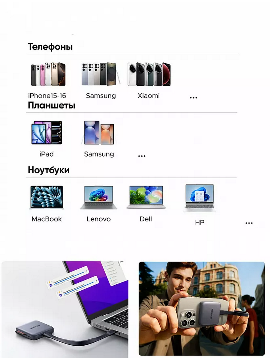 Устройство поддерживает различные форматы карт памяти, включая SD, SDHC, SDXC, microSD, microSDHC и microSDXC. Это делает его незаменимым аксессуаром для хранения и передачи данных.