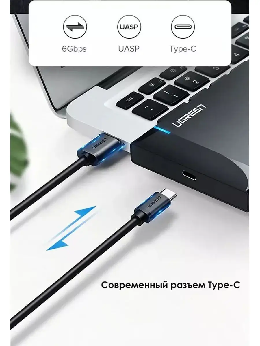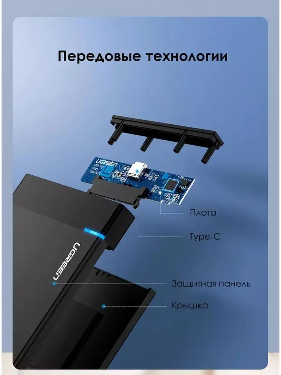 Внешний бокс Ugreen US221 не требует внешнего питания. Энергия, необходимая для функционирования накопителя, поступает от USB. Интерфейс подключения USB 3.0 Type-C гарантированно позволяет реализовать скоростные возможности любого SATA-устройства. В оснащение внешнего бокса входит индикатор передачи данных.
