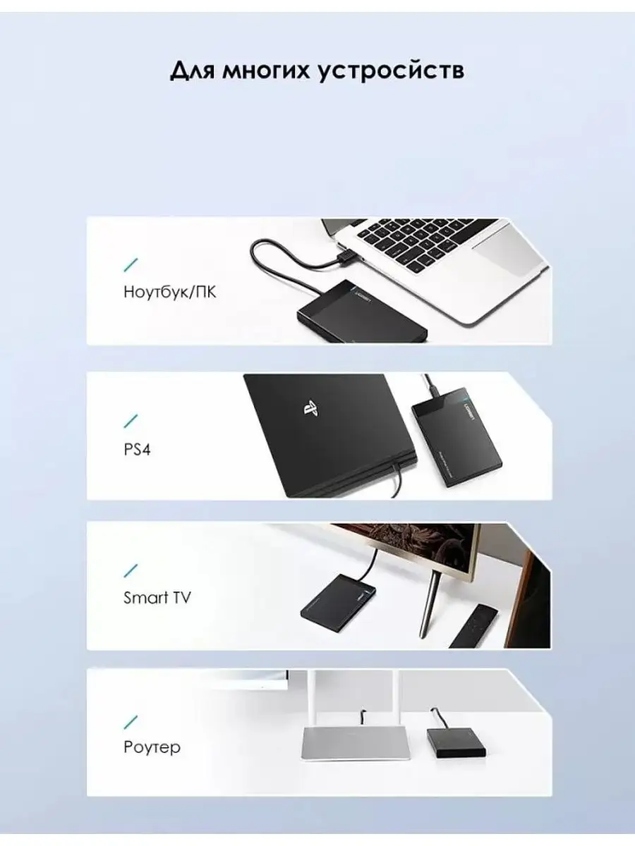 Внешний бокс Ugreen US221 может быть полезен любым пользователям компьютеров (как стационарных, так и мобильных). Модель совместима с 2.5-дюймовыми HDD и SSD, обмен информацией с которыми осуществляется посредством интерфейса SATA. Фактически устройство представляет из себя внешний накопитель, объем которого можно определять самостоятельно.
