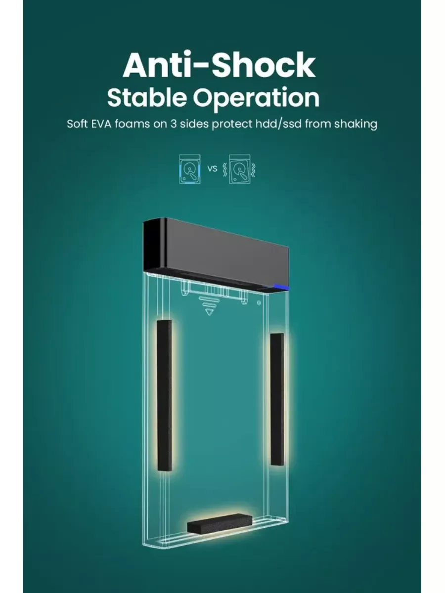 Безопасный режим работы жесткого диска: синий светодиодный индикатор позволяет легко узнать рабочее состояние. Прикрепленная внутри пена EVA защищает ваши жесткие диски от неправильного встряхивания и царапин. Благодаря съемному 30-сантиметровому кабелю его довольно легко подключить и взять с собой. (ПРИМЕЧАНИЕ: Если на вашем жестком диске есть винты, вам следует извлечь его. В противном случае он не поместится в наш корпус)