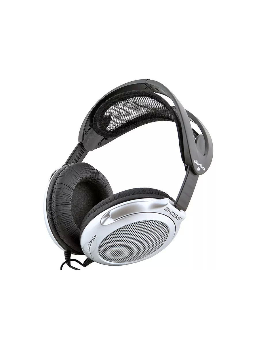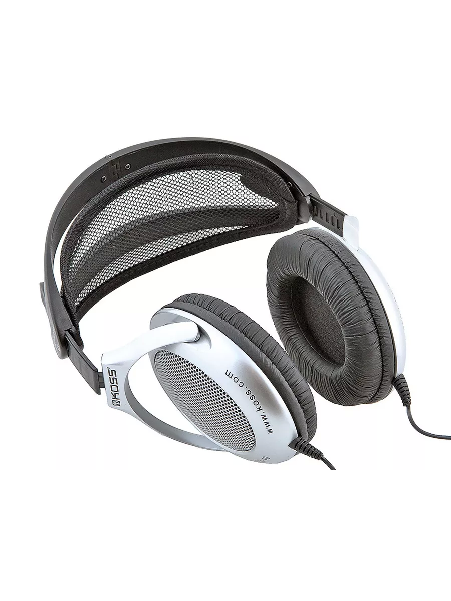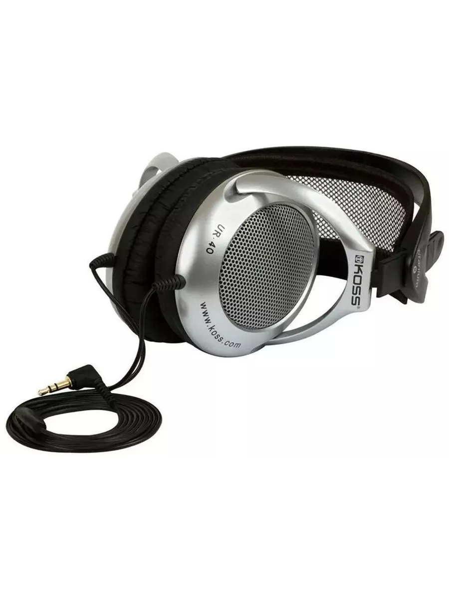 KOSS UR40 — черные наушники открытого типа с накладными амбушюрами. Они имеют стильный и одновременно эргономичный дизайн. Легкие плоские чаши с амбушюрами из экокожи крепятся на тонком двойном оголовье, нижняя часть которого сделана в виде сеточки.