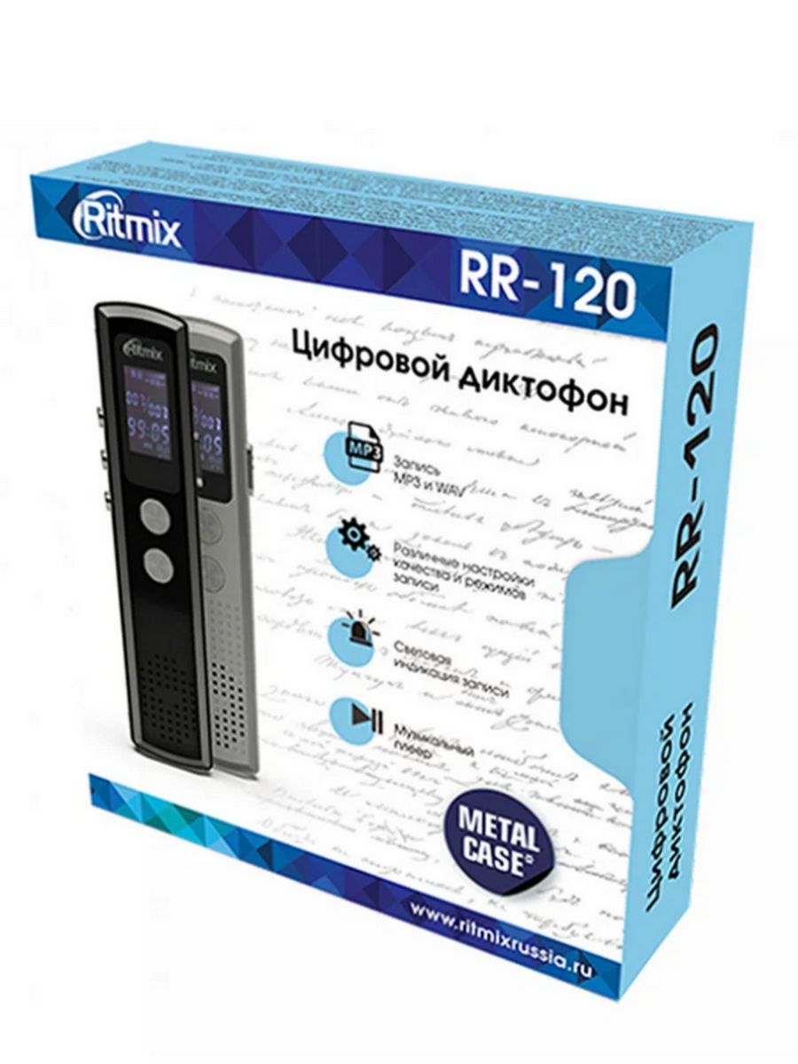 Ritmix RR-120 - это компактный цифровой диктофон в стильном корпусе из металла. Рекордер обладает функцией музыкального плеера, что позволяет слушать музыку в форматах MP3, WAV, APE, WMA, FLAC.