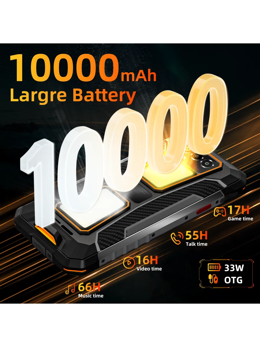 Oukitel WP58 Pro — это защищённый смартфон с мощным аккумулятором 10 000 мАч, поддержкой быстрой зарядки 33 Вт и функцией пауэрбанка на 10 Вт. Главная особенность модели — два кемпинговых фонаря на задней панели: холодный на 1000 люмен и тёплый на 900 люмен, которые можно использовать по отдельности или одновременно.