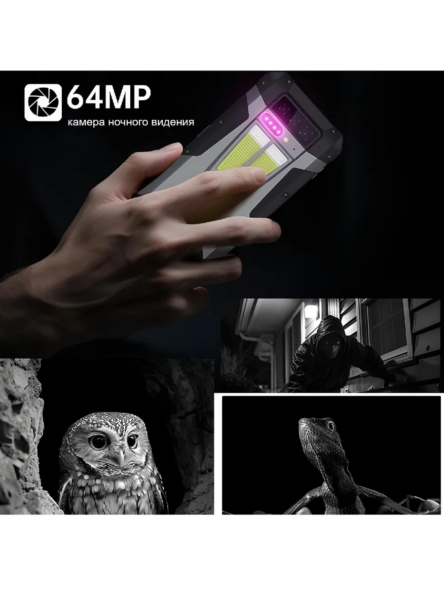 Тройная камера сочетает 50 МП основную матрицу, 64 МП модуль ночного видения и 8 МП телеобъектив с 3-кратным оптическим зумом. Поддержка 4K-видео, инфракрасная подсветка и режим подводной съемки позволяют получить отличный кадр в любых условиях — от строительной площадки до ночного похода.