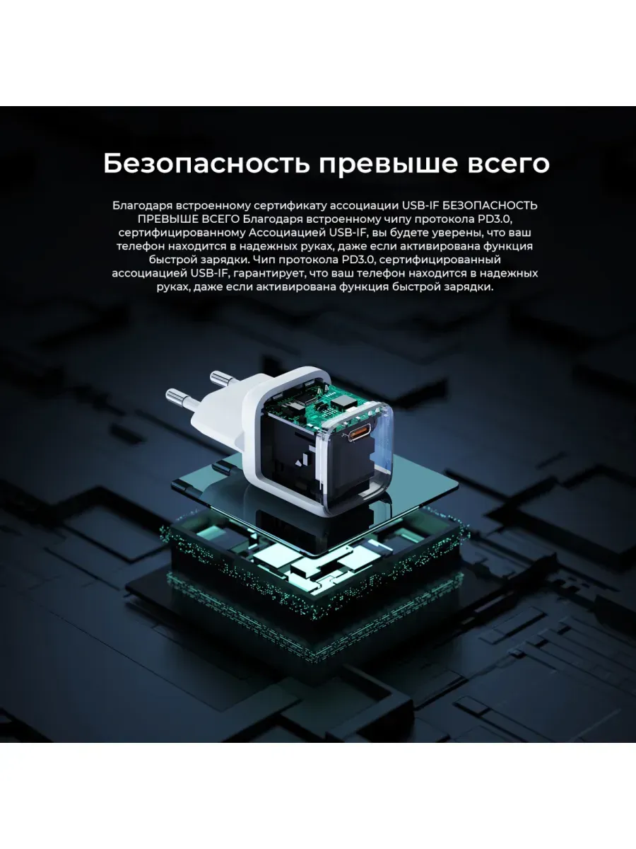 Сетевая зарядка имеет эргономичный дизайн. Сверхкомпактный корпус выполнен из качественного ABS-пластика с покрытием Soft-touch. Зарядку удобно брать с собой в дорогу, она занимает минимум места.