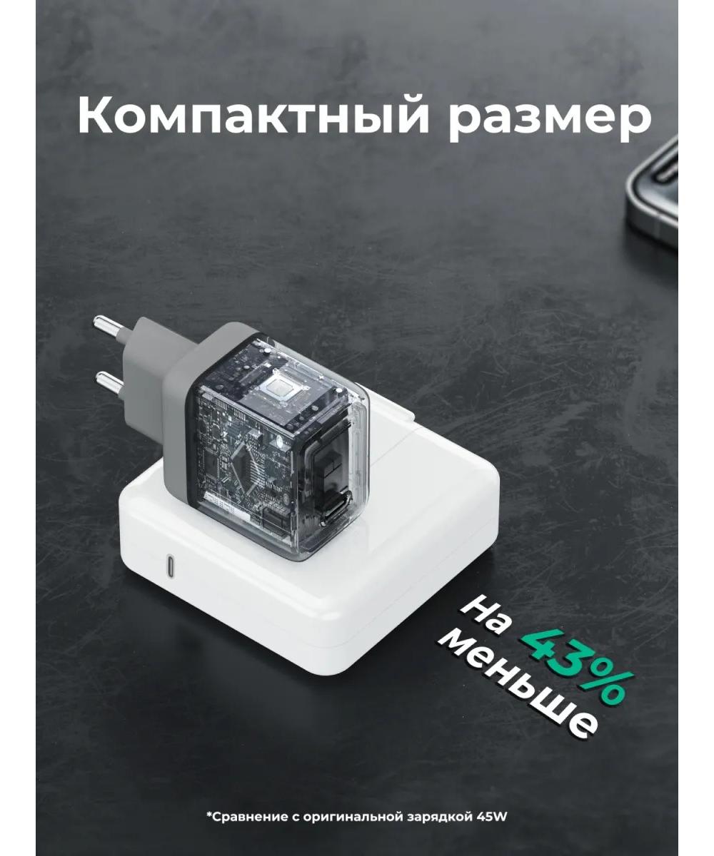 Зарядный блок оборудован одним портом USB Type-C, функцией быстрой зарядки с мощностью до 45 Вт и всё это в лёгком, компактном корпусе