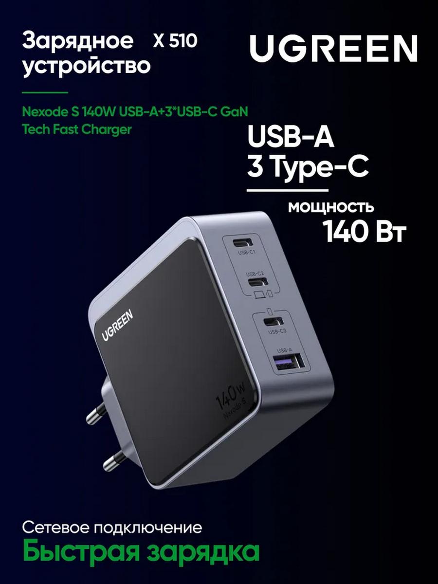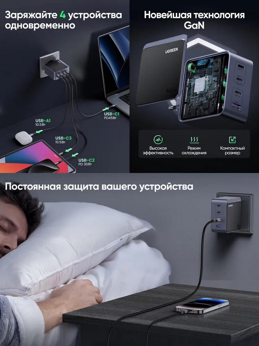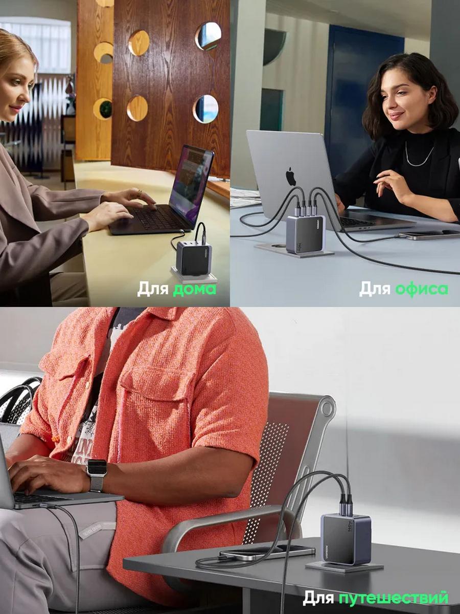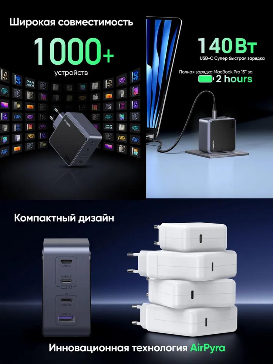 UGREEN X570 GaN PD 140Вт — это универсальное многопортовое зарядное устройство, созданное для максимально быстрой и безопасной зарядки ноутбуков, смартфонов, планшетов и аксессуаров. Суммарная мощность до 140Вт позволяет одновременно заряжать до четырёх устройств без потери скорости и стабильности работы.