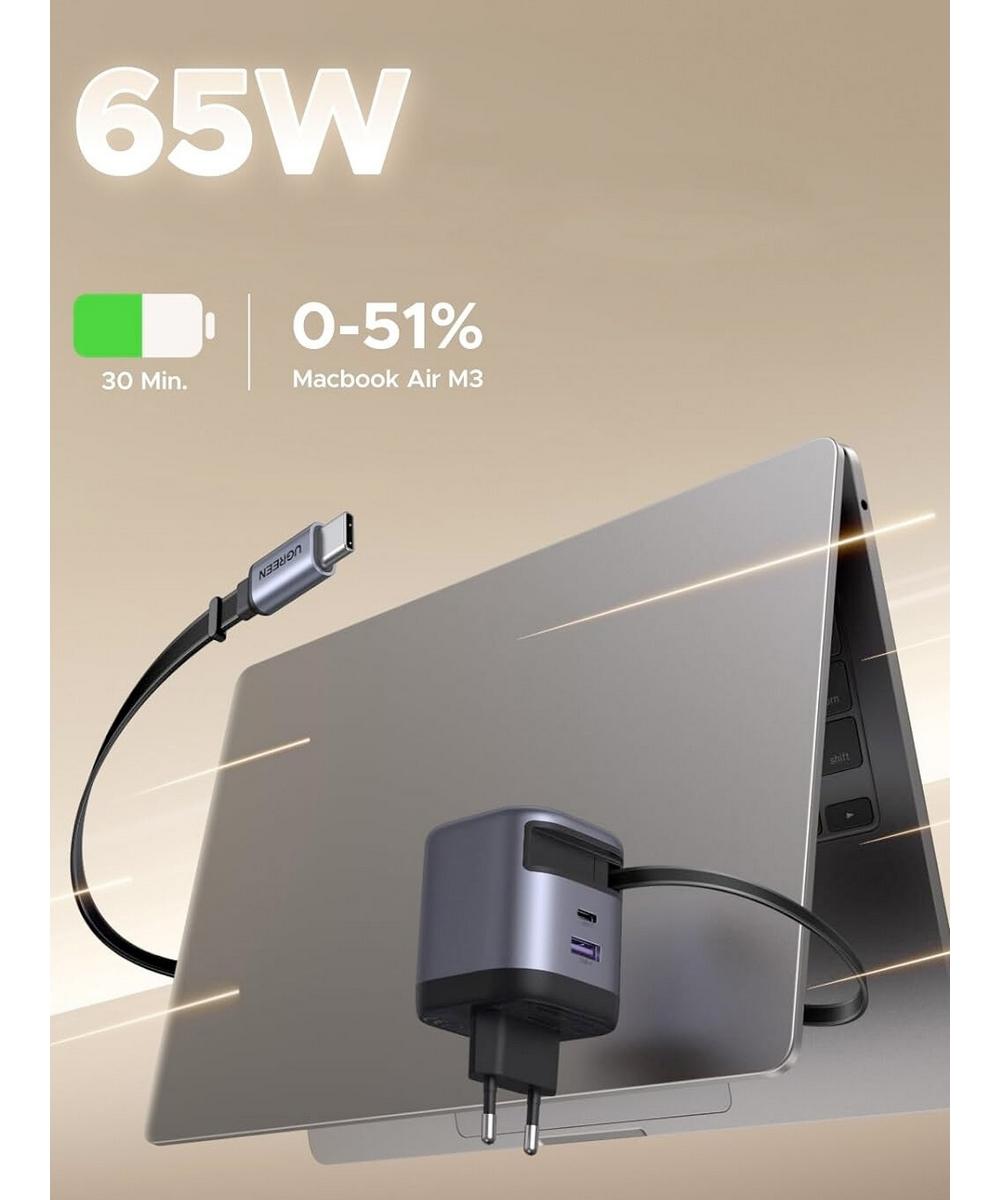 Сетевая зарядка UGREEN (60828) 3 порта, выдвижной кабель 70 см- 100Вт