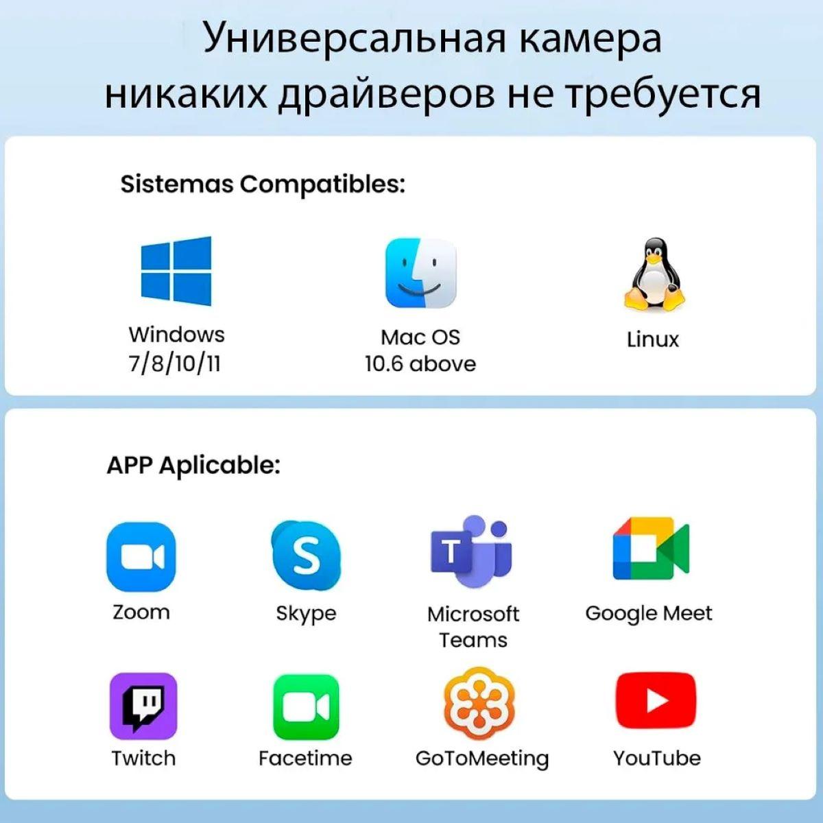 Веб-камера поддерживает технологию Plug-and-Play и легко подключается через USB без установки драйверов. Длинный кабель длиной 6,6 фута обеспечивает гибкость размещения камеры на мониторе, ноутбуке, телевизоре или штативе. Совместимость с популярными платформами и операционными системами делает устройство отличным выбором для видеозвонков, онлайн-конференций, стриминга и записи контента.