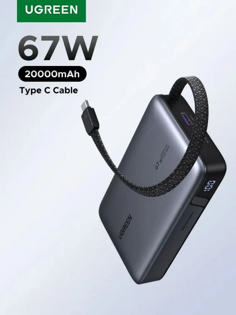 Внешний аккумулятор Ugreen PB550 PD емкостью 20000 mAh оснащен 2 разъемами Type-C + USB-A + встроенным кабелем, что позволяет подключить к нему одновременно до 3 устройств и не беспокоиться об их безопасности.