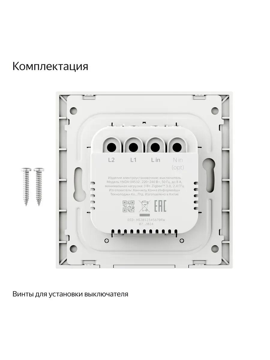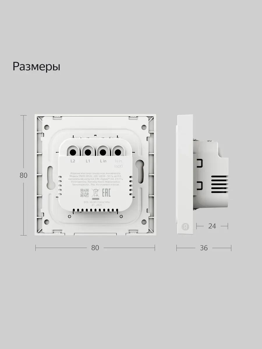 Выключатель Яндекс YNDX-00532 белого цвета размером 80×80×36 мм оснащен 2 клавишами. Он может управлять 2 коммутируемвми линиями. Устройство используется для дистанционного управления светом и питанием электрических приборов. Модель поддерживает беспроводное подключение по протоколу Zigbee.