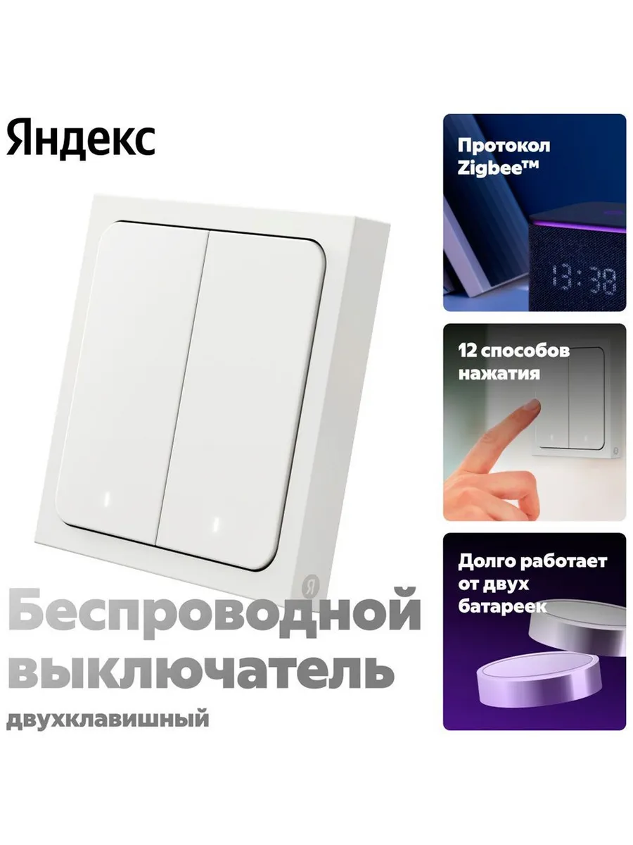 Беспроводной умный выключатель Яндекс YNDX-00535 можно установить на любую поверхность с помощью клейкой ленты, например, рядом с кроватью для бесшумного управления светом или умными шторами, либо разместить его в прихожей, чтобы одним движением включать или выключать свет во всех комнатах. Также он легко связывается с проводными выключателями или реле, позволяя управлять подключёнными устройствами из любого уголка квартиры. управляйте освещением или другими устройствами с помощью нажатий, когда использование голоса неудобно.