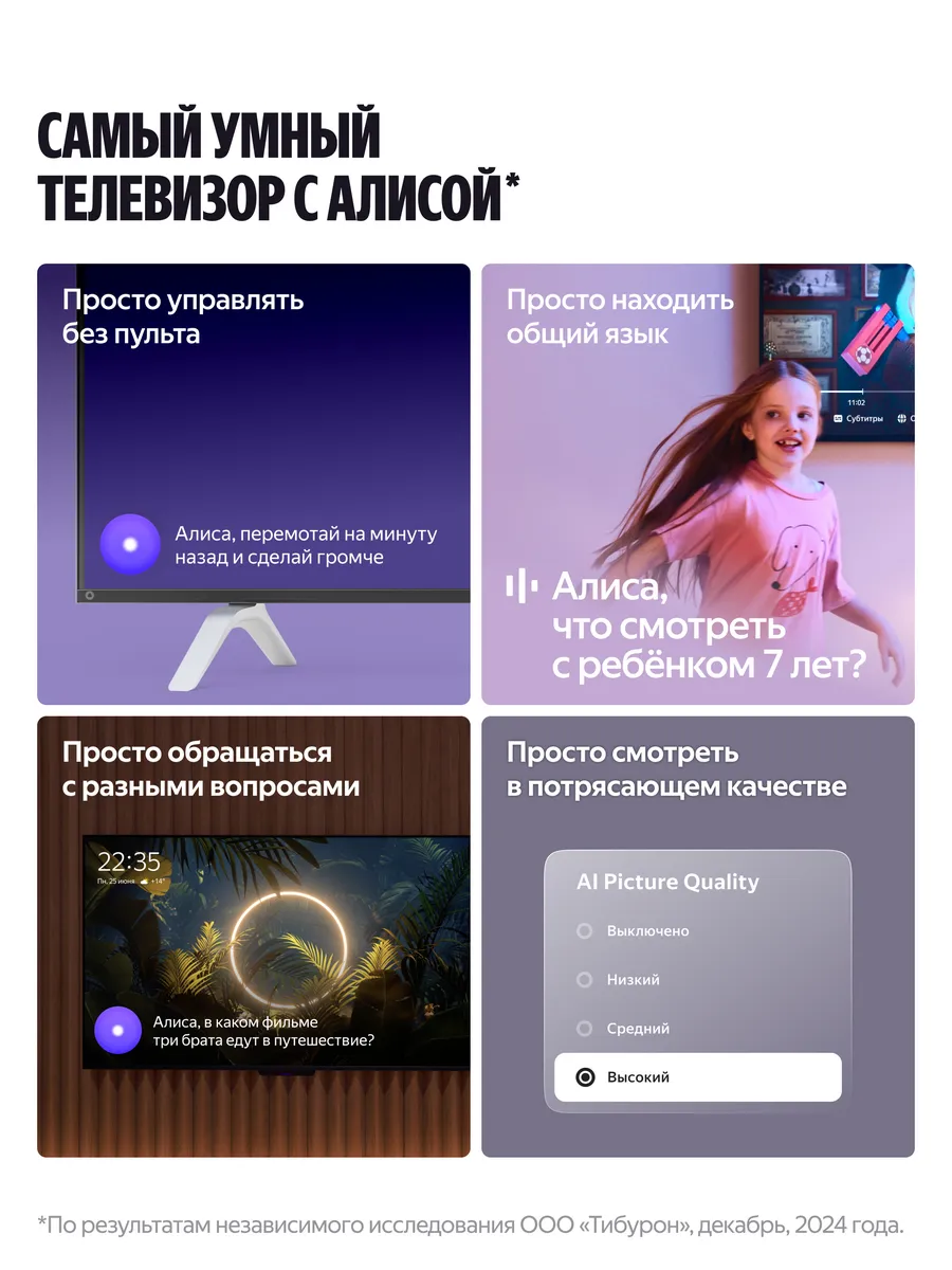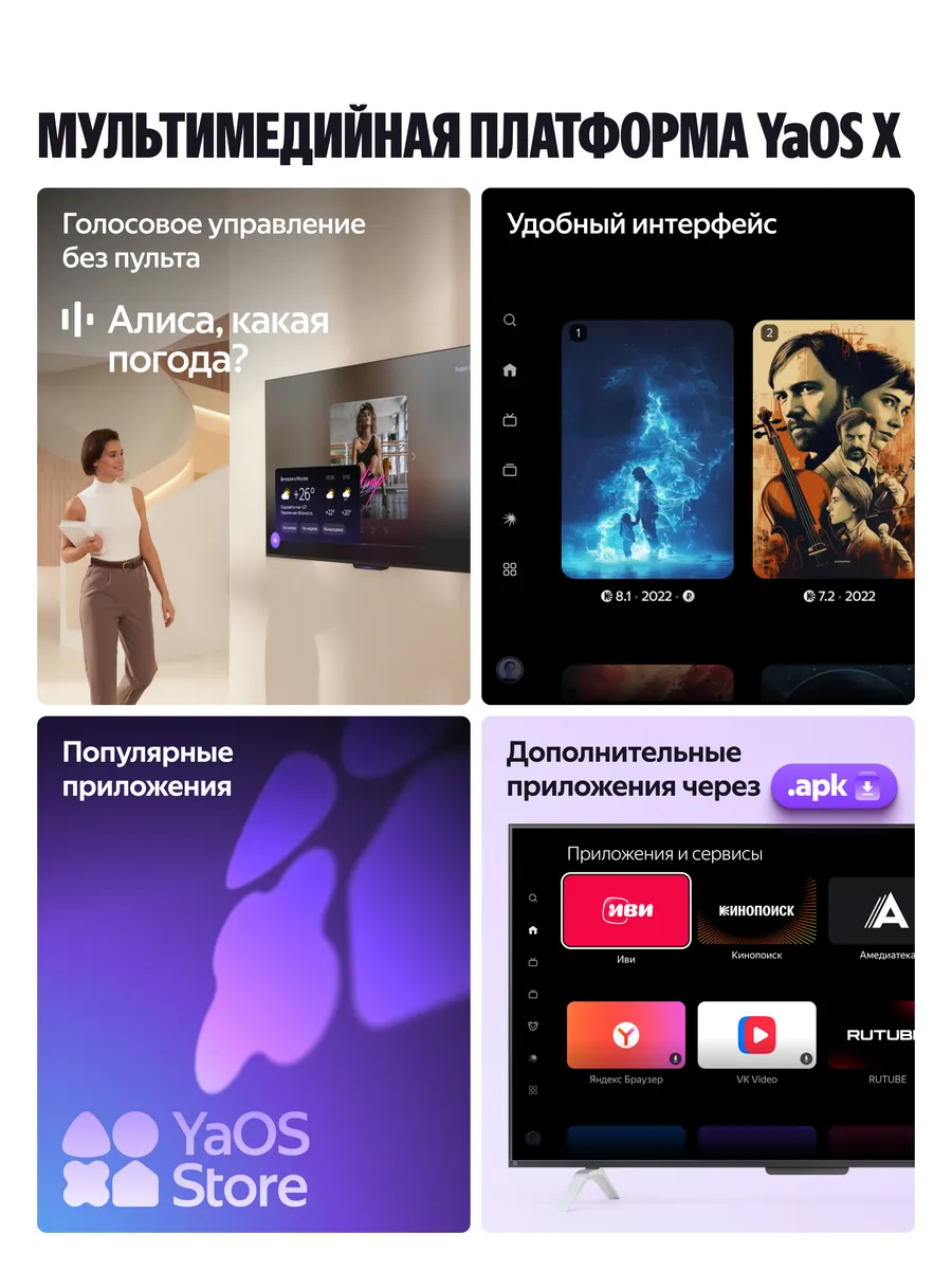 Телевизор работает на фирменной платформе Яндекс ТВ с удобным и интуитивно понятным интерфейсом, поддержкой популярных онлайн-кинотеатров и сервисов, а также голосовым управлением с помощью Алисы, встроенной прямо в устройство. Вы можете искать контент, управлять настройками и умным домом, просто отдавая голосовые команды.