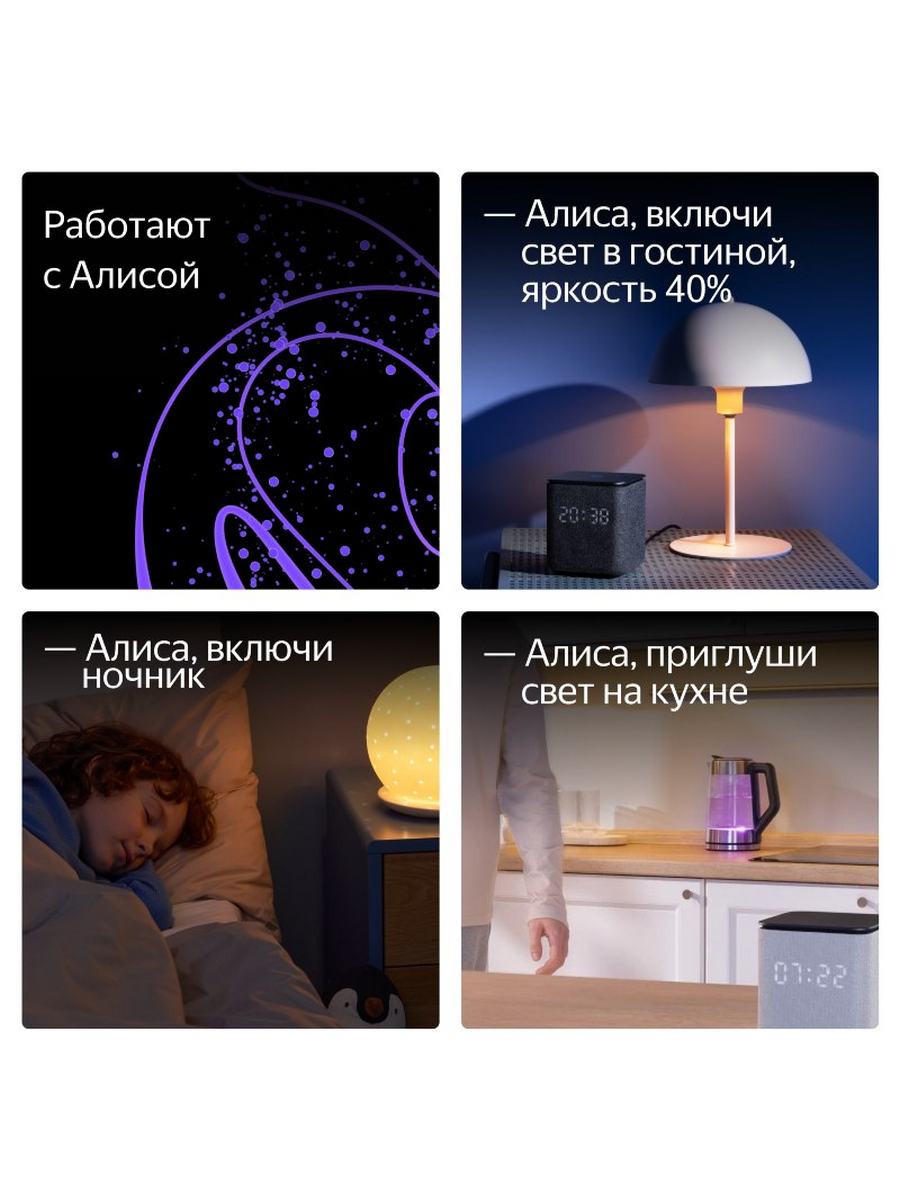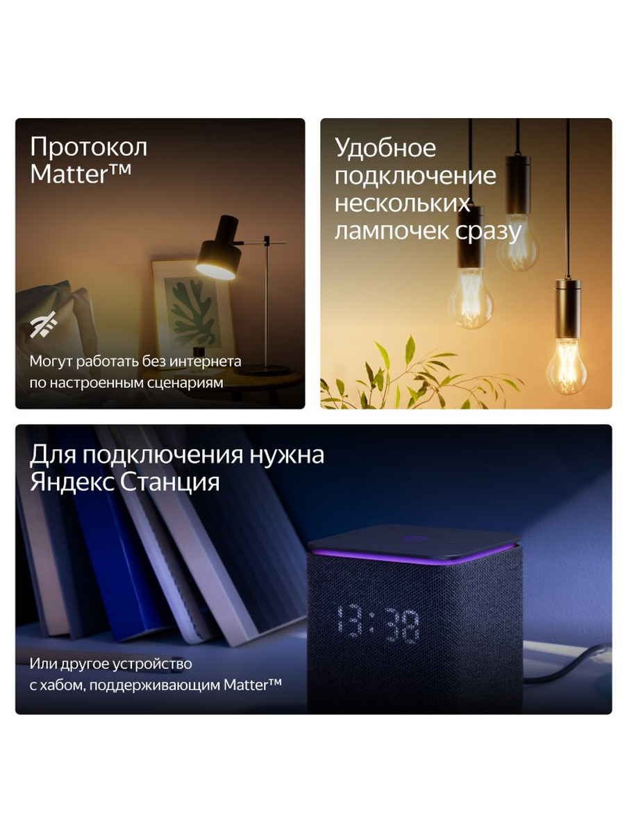 Лампочка работает на протоколе Matter over Wi-Fi, она легко подключается к умному дому, а настроенные сценарии с лампочкой могут работать, даже если отключится интернет. Для подключения к умному дому вам потребуются приложение Дом с Алисой и одна из совместимых Яндекс Станций или другое устройство с хабом, поддерживающим протокол Matter