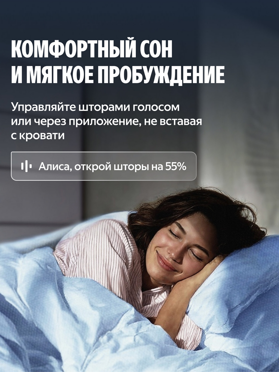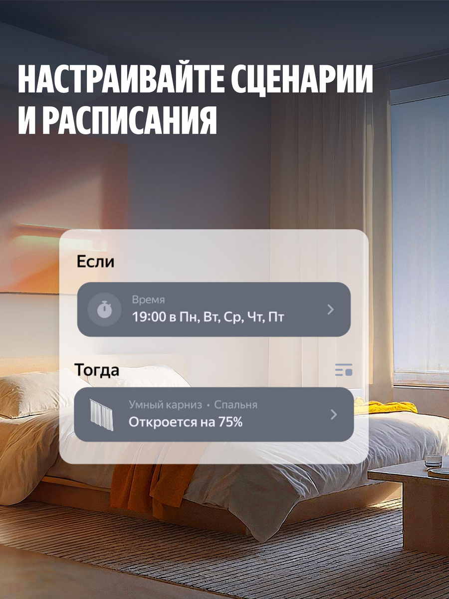 ● Голосом: объедините умный карниз с Яндекс Станцией и управляйте шторами с помощью голосовых команд. Также можно задавать степень открытия штор: «Алиса, открой шторы на 80%».